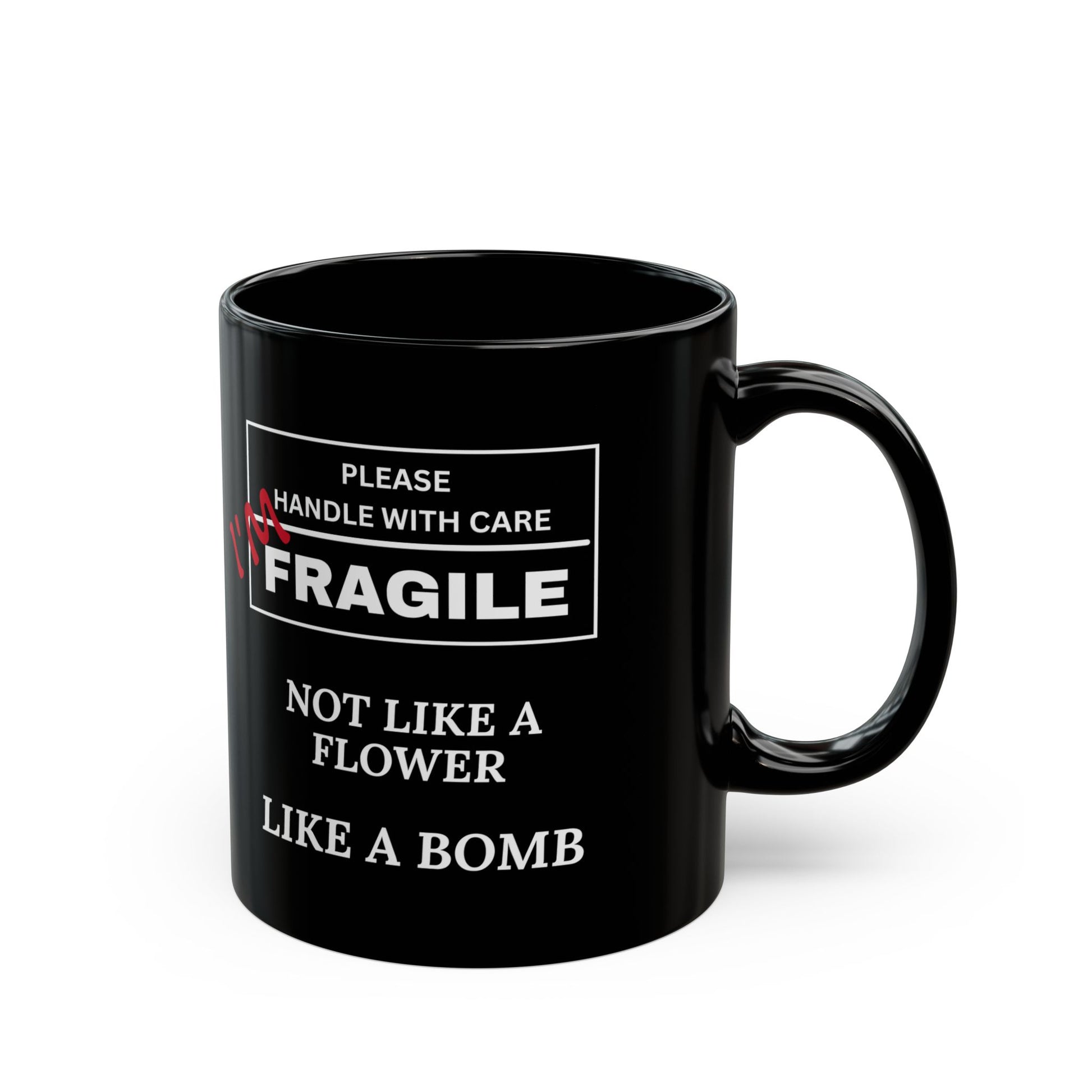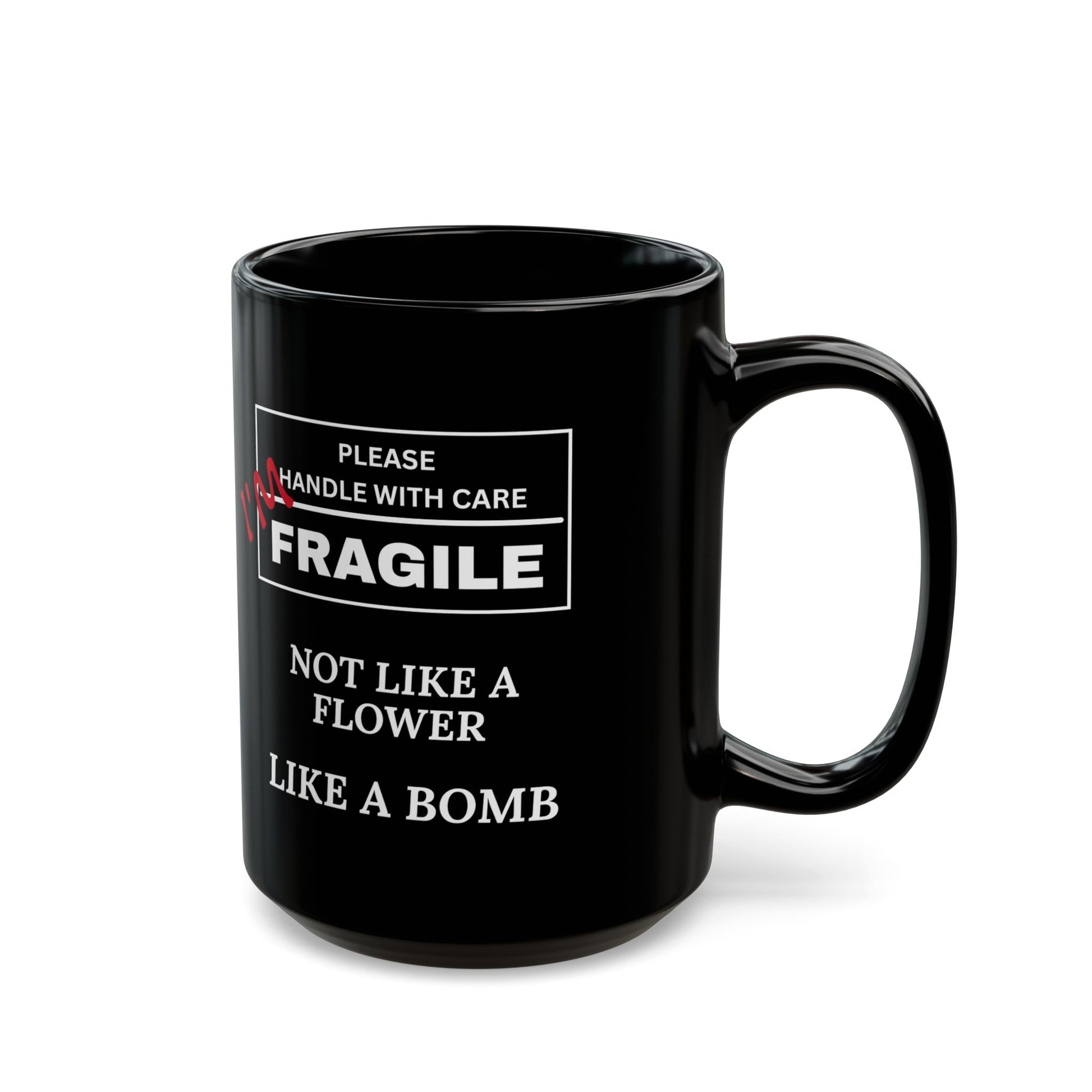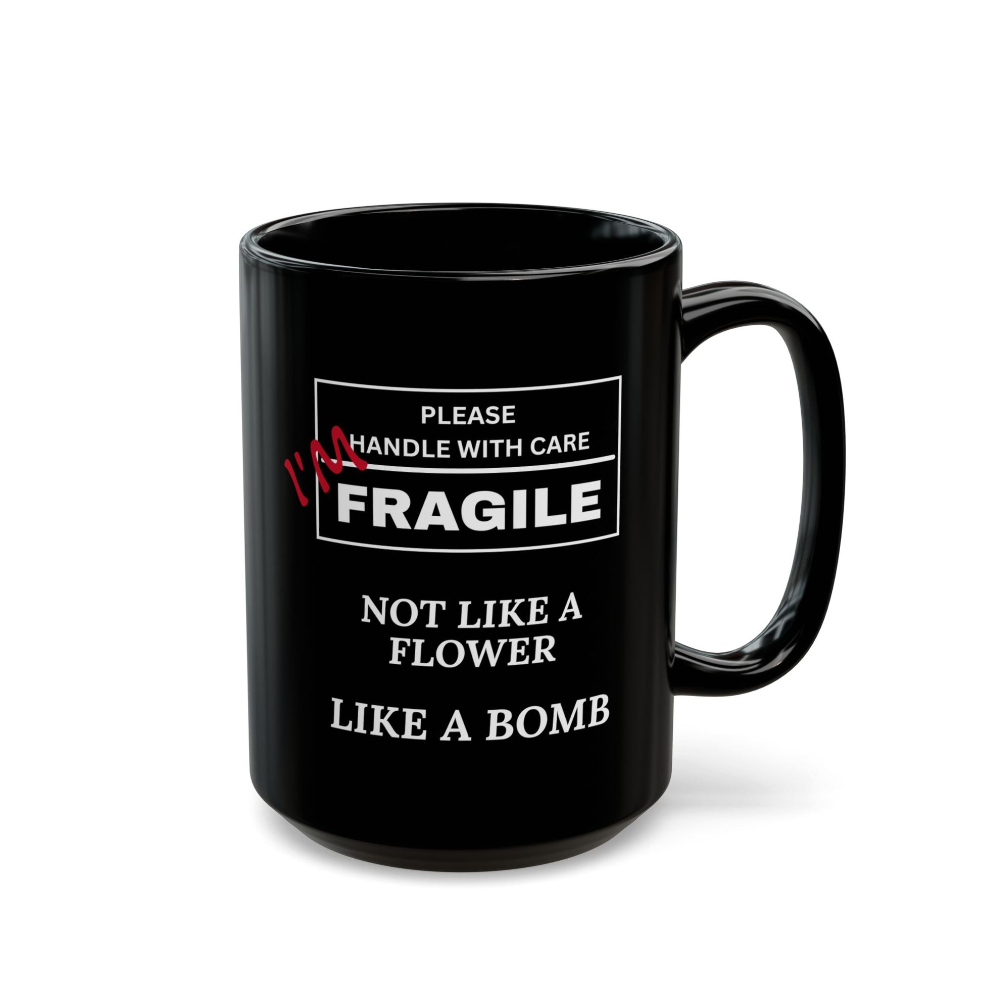 "Fragile, Not Like a Flower, Like a Bomb" Black Ceramic Mug (11oz & 15oz)