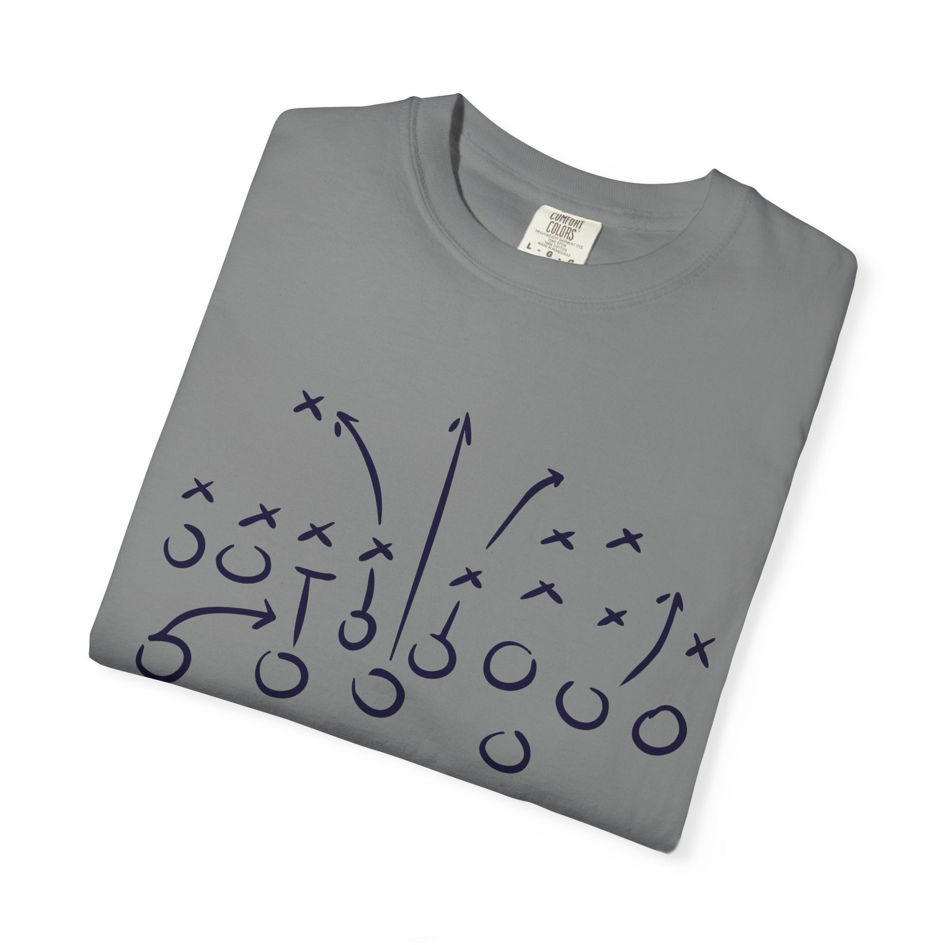 Feel the buzz on game day with this soft, garment-dyed tee that wears the playbook on its chest. Hand-drawn route lines in bright orange slice across a relaxed, heavyweight cotton body—like chalk on turf—giving a worn-in, authentic look that reads like a veteran player’s favorite shirt. The soft dye and tubular knit create a lived-in texture that settles into your rotation; the double-needle stitching and sturdy fabric mean it stands up to tailgate weather, stadium seats, and post-game hangs. Slip it on for kickoff, pair it with jeans and a cap, and let the sketch-like routes start conversations with fellow fans and backyard strategists. It’s built for people who live for the play — calling audibles, watching film, and crowding the couch on championship Sundays.