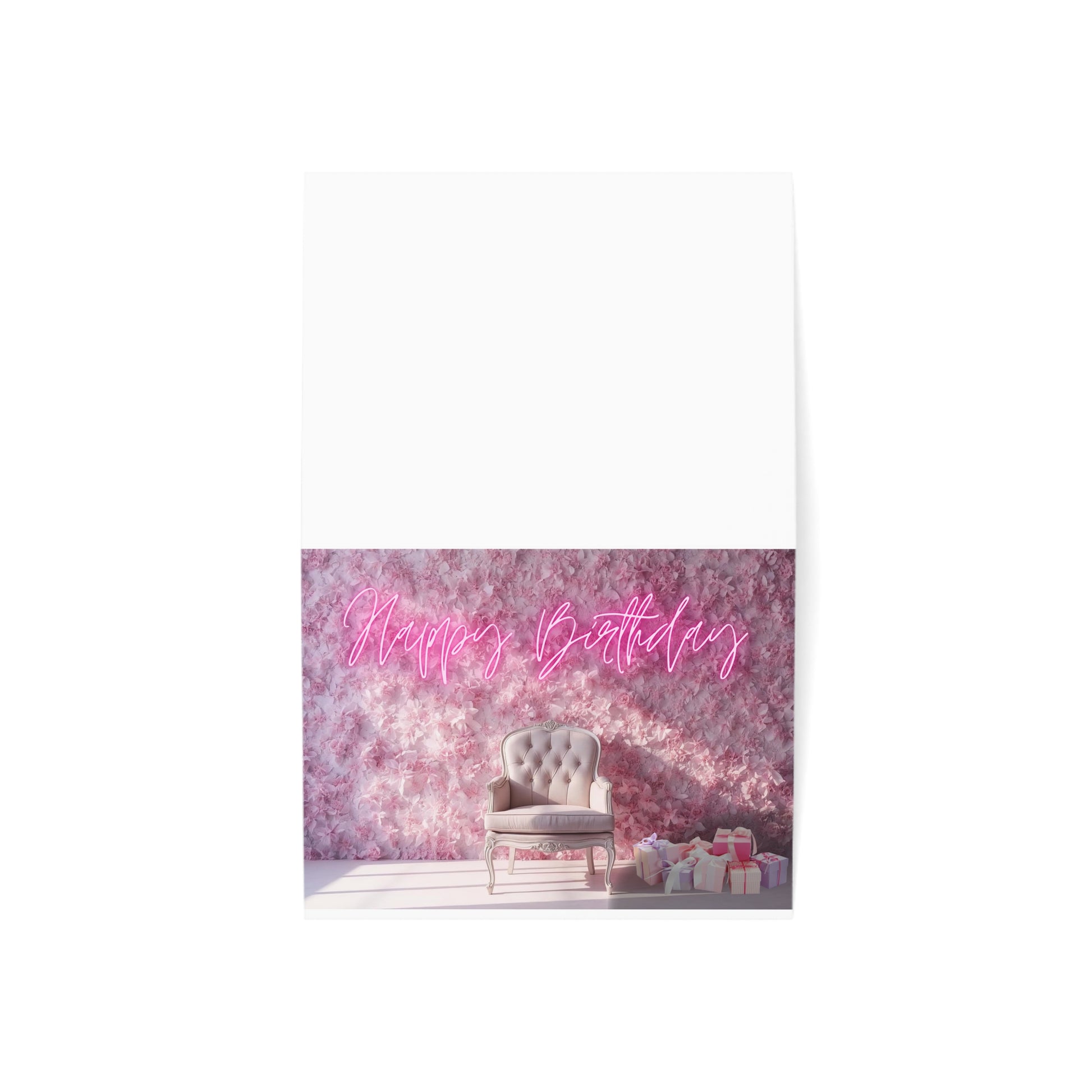 A soft, heartfelt greeting card that captures quiet elegance and warm appreciation. The front shows a plush vintage chair set against a textured pink floral backdrop, with glowing script text that reads “Happy Birthday.” Inside is crisp, blank white space ready for your personal message. The card’s satin-like finish and vivid color printing make the blush tones and delicate details sing. It arrives with a matching envelope and feels substantial in the hand — like a small keepsake meant to be saved and reread.