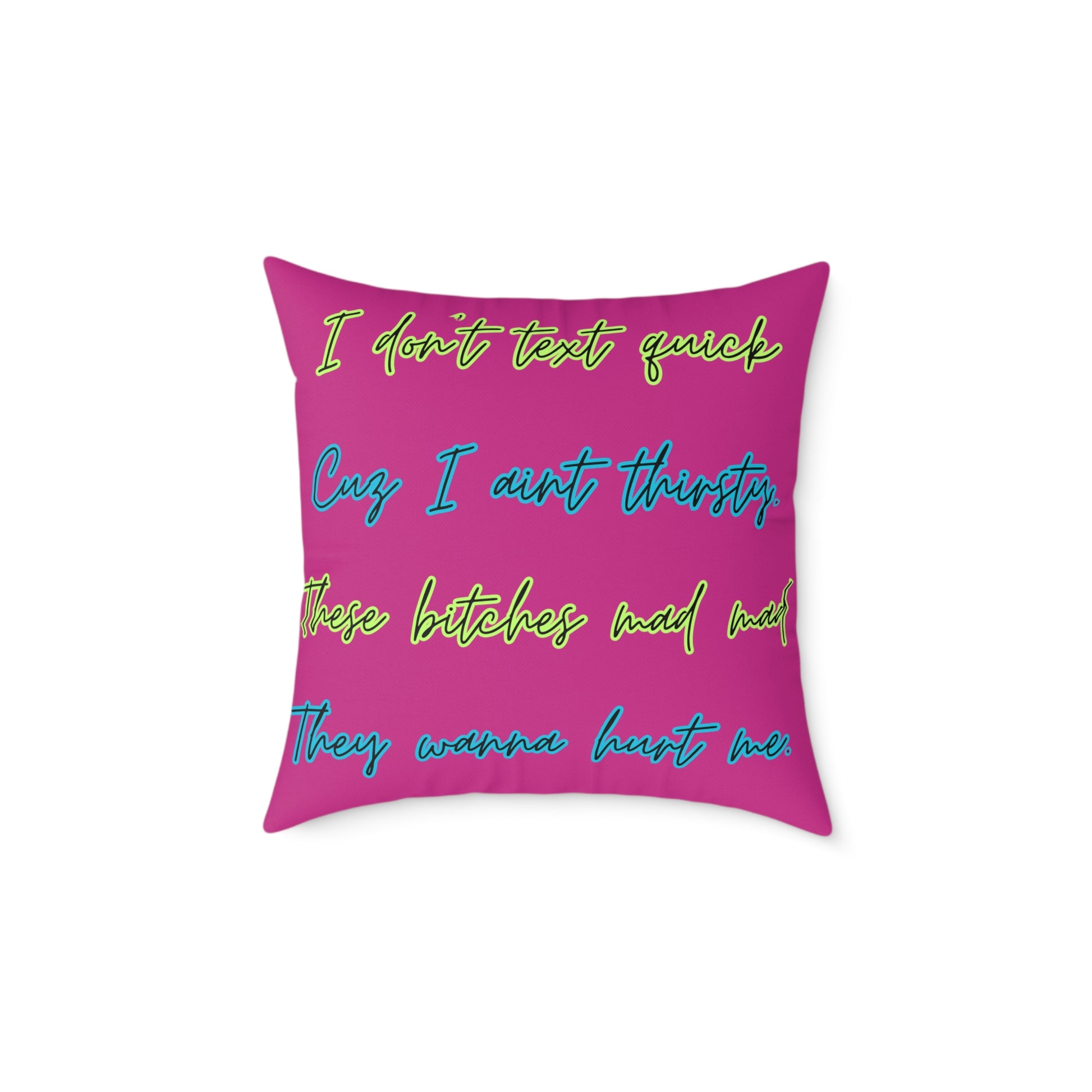 This square poly canvas pillow brings bold color and playful attitude to any casual space. Bright neon text pops against a hot pink background, giving rooms an energetic, tongue-in-cheek vibe. The dense polyester filling and soft canvas face make it comfortable to lean against on the floor or lounge on the couch. Double-sided printing keeps the cheeky message visible from every angle, while a hidden zipper keeps the cover neat and easy to remove for spot cleaning. Choose from five sizes to suit a cozy reading nook, dorm room, or lively hangout spot.