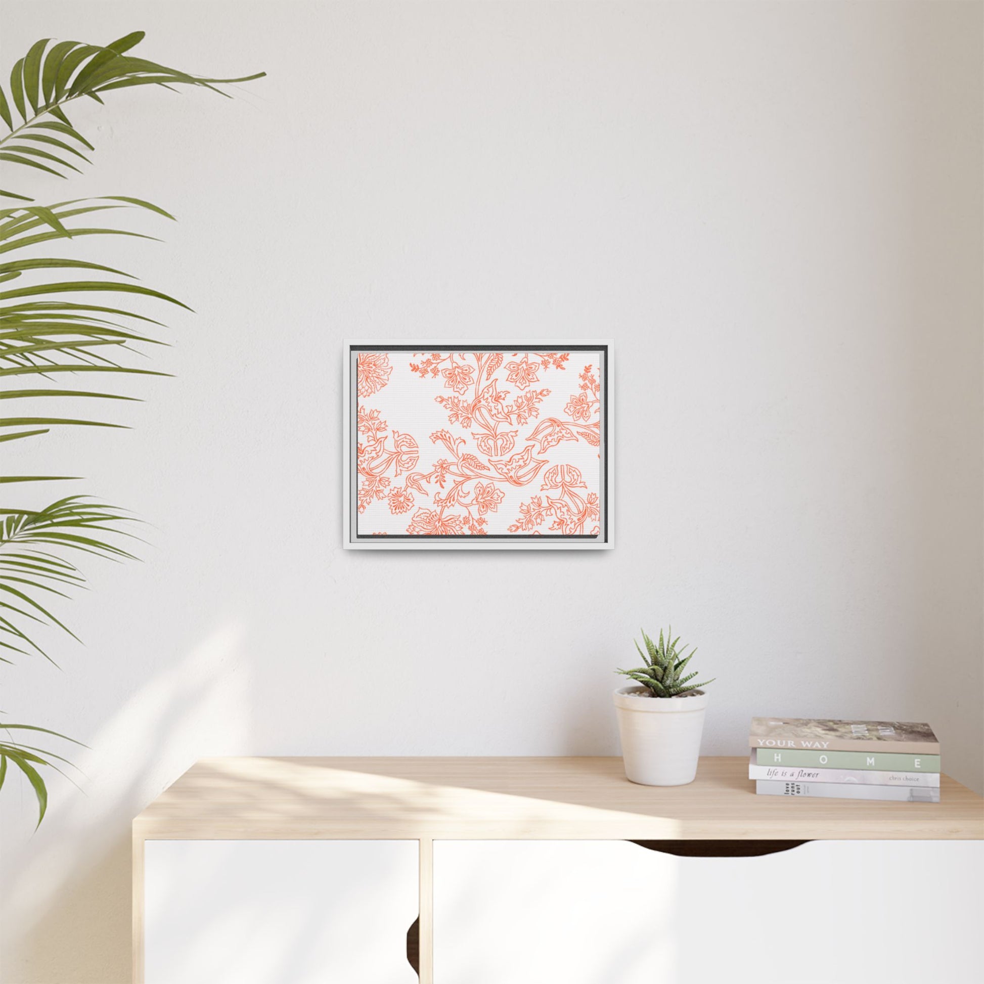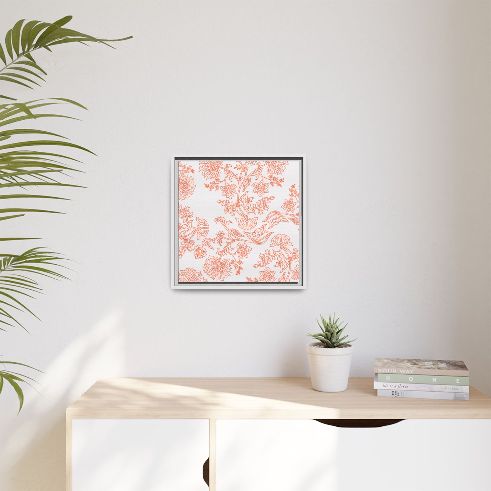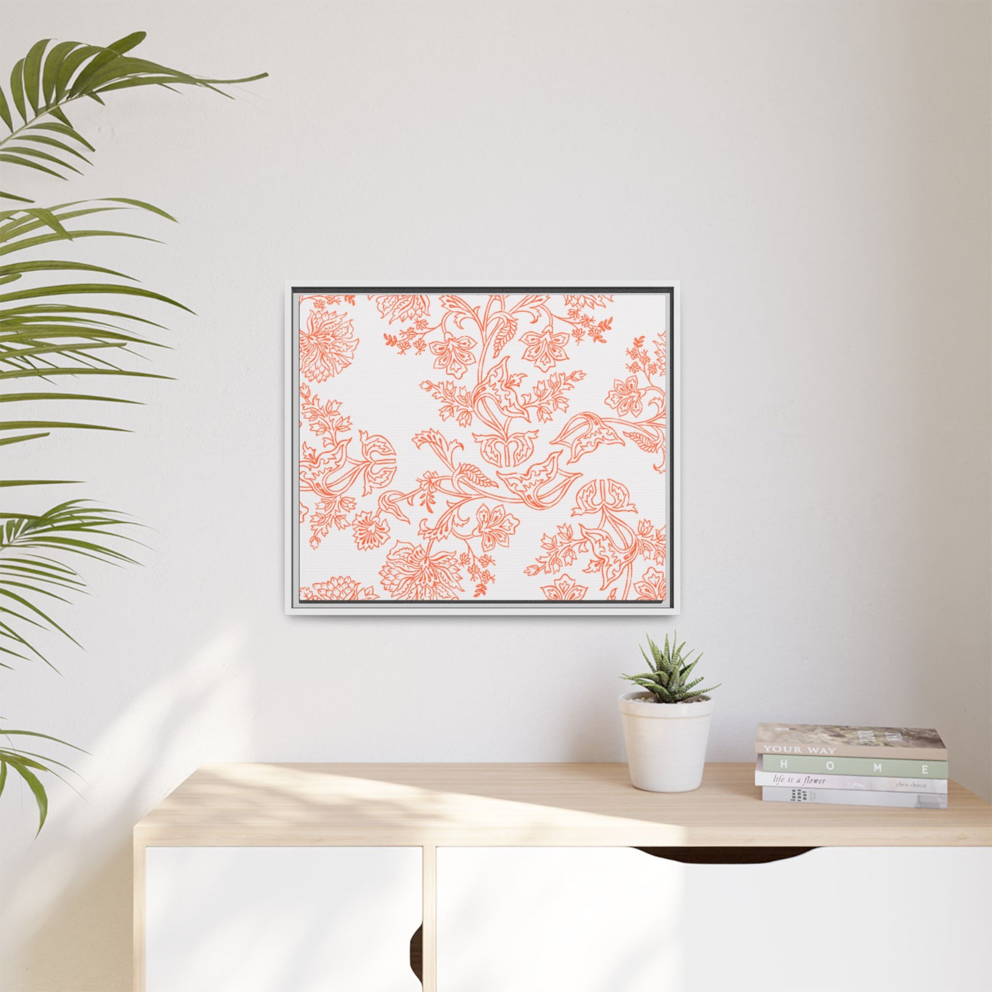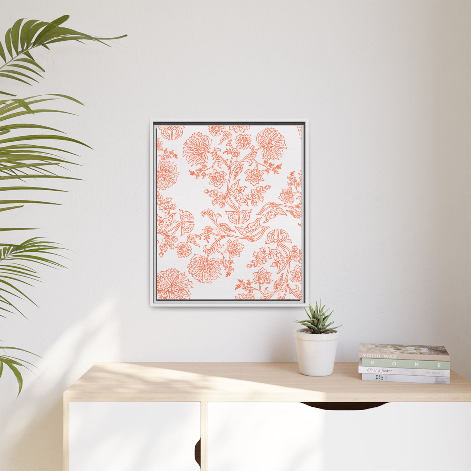 Orange Floral Matte Canvas, White Wooden Framed, Bathroom Decor, Matching Shower Curtain Available, Coral/orange
