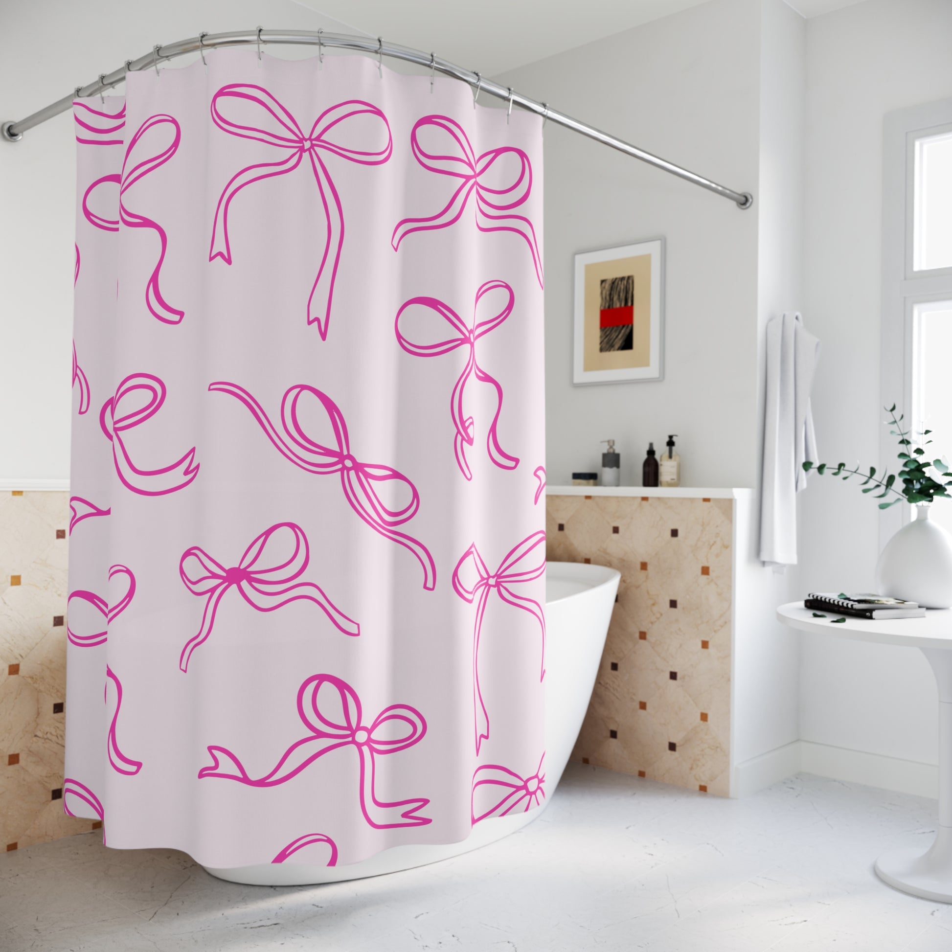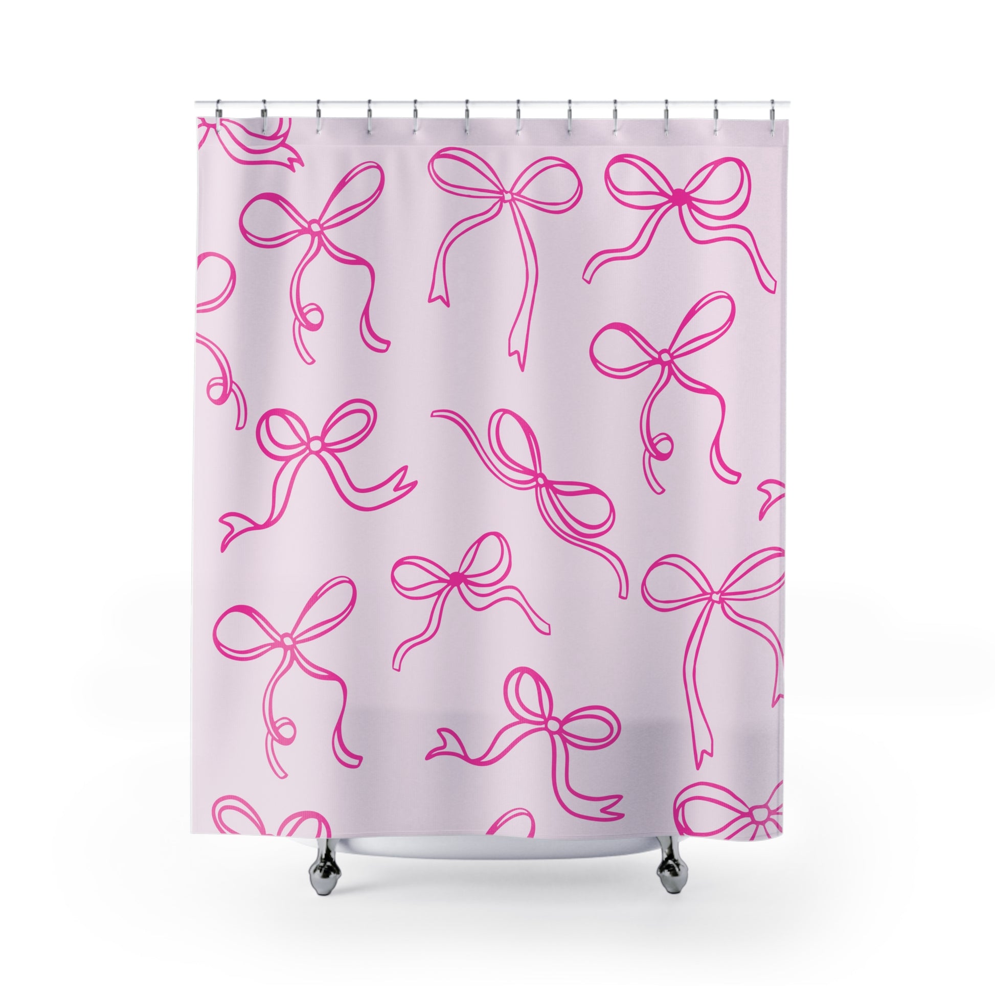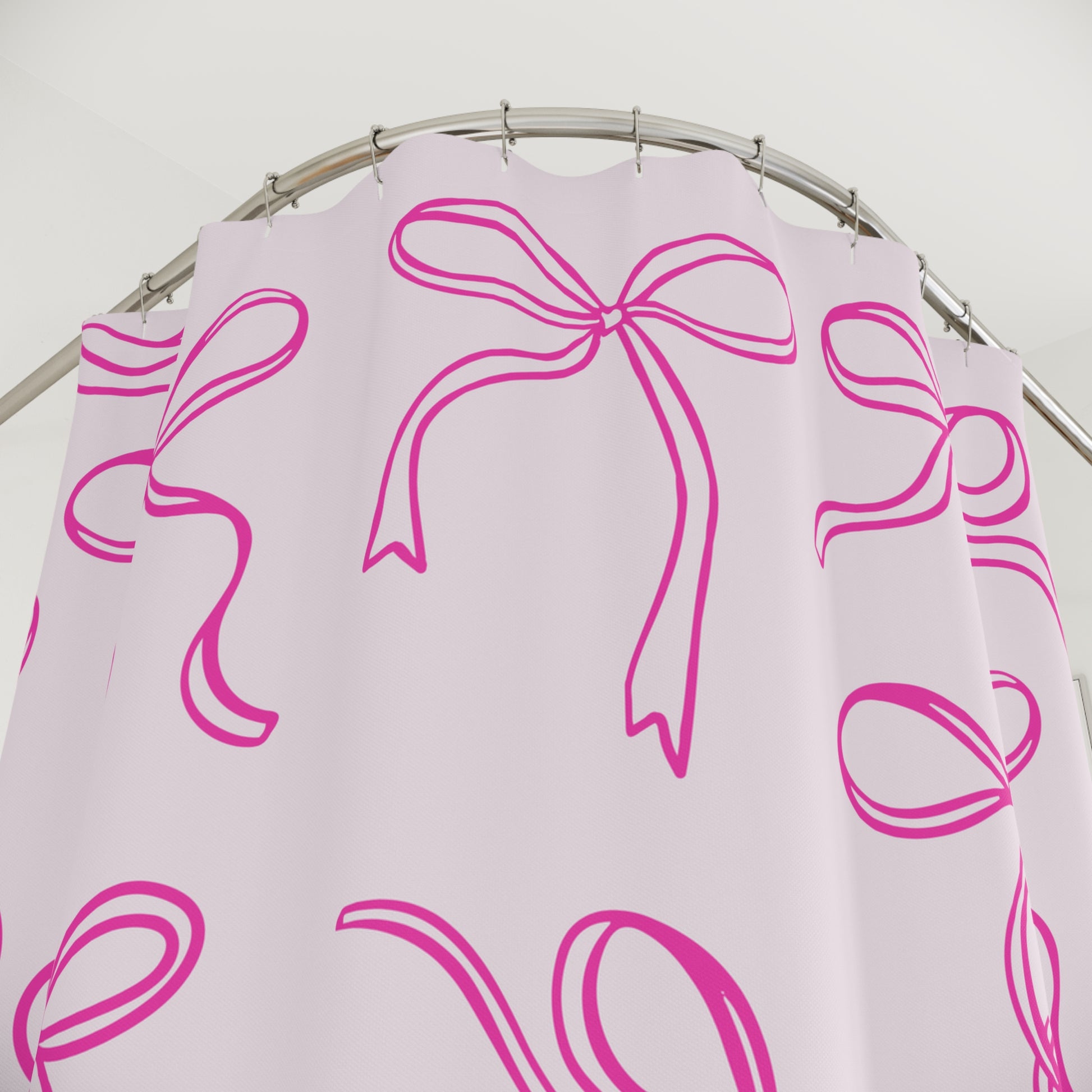 Soft, playful bows dance across a pale pink background, turning an everyday bathroom into a space that feels thoughtfully styled. This polyester shower curtain brings a light, whimsical touch—bold fuchsia lines form hand-drawn ribbon shapes that read as both modern and sweet. It hangs easily from 12 standard hooks (not included) and dries quickly, so the pattern stays fresh without extra care. Let it be the gentle, cheerful note that brightens morning routines or adds a feminine accent to a guest bath.