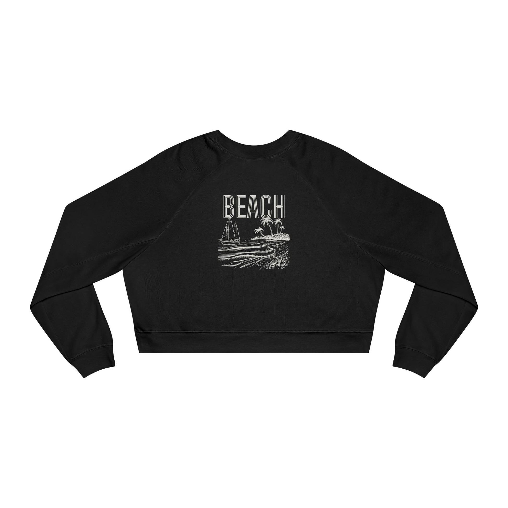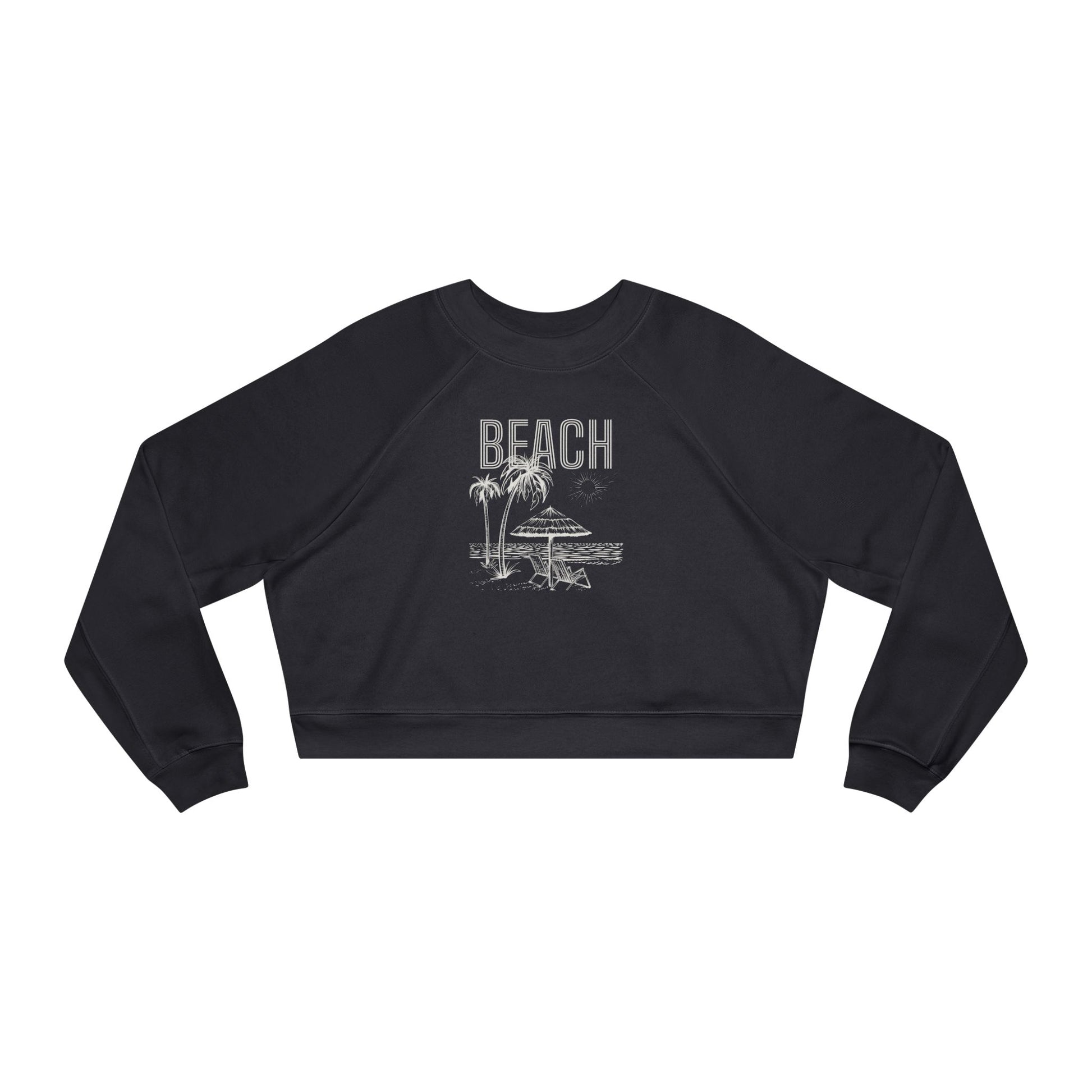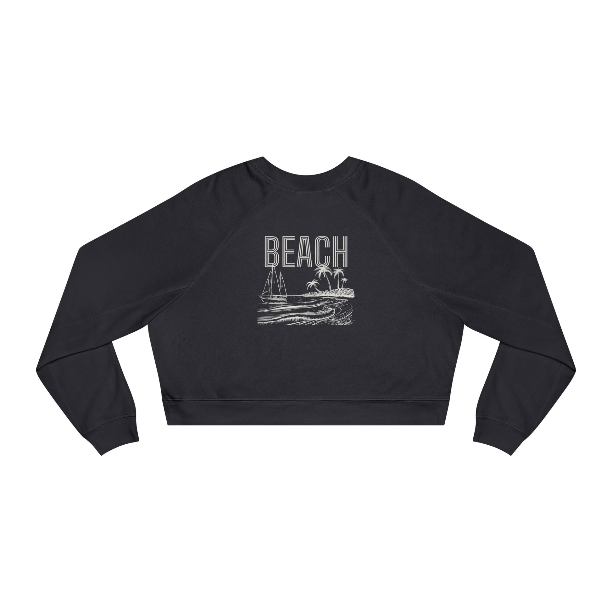 Salt-splashed afternoons folded into a mid-length fleece — this cropped pullover channels lazy beach days and breezy boardwalk walks. The relaxed raglan cut lets you layer a tank or tee underneath without feeling bulky, while the soft combed-ring spun cotton blend keeps the fabric smooth against skin. A muted, weathered 'BEACH' graphic sits centered on the back, evoking sun-bleached signs, palm silhouettes, and the hush of rolling surf. Wear it over high-waist shorts after a sunset dip, on crisp mornings with a coffee in hand, or as the throw-on comfort for a coastal road trip. It’s casual, lived-in, and quietly nostalgic — built to move with you and collect memories, not fuss over them.