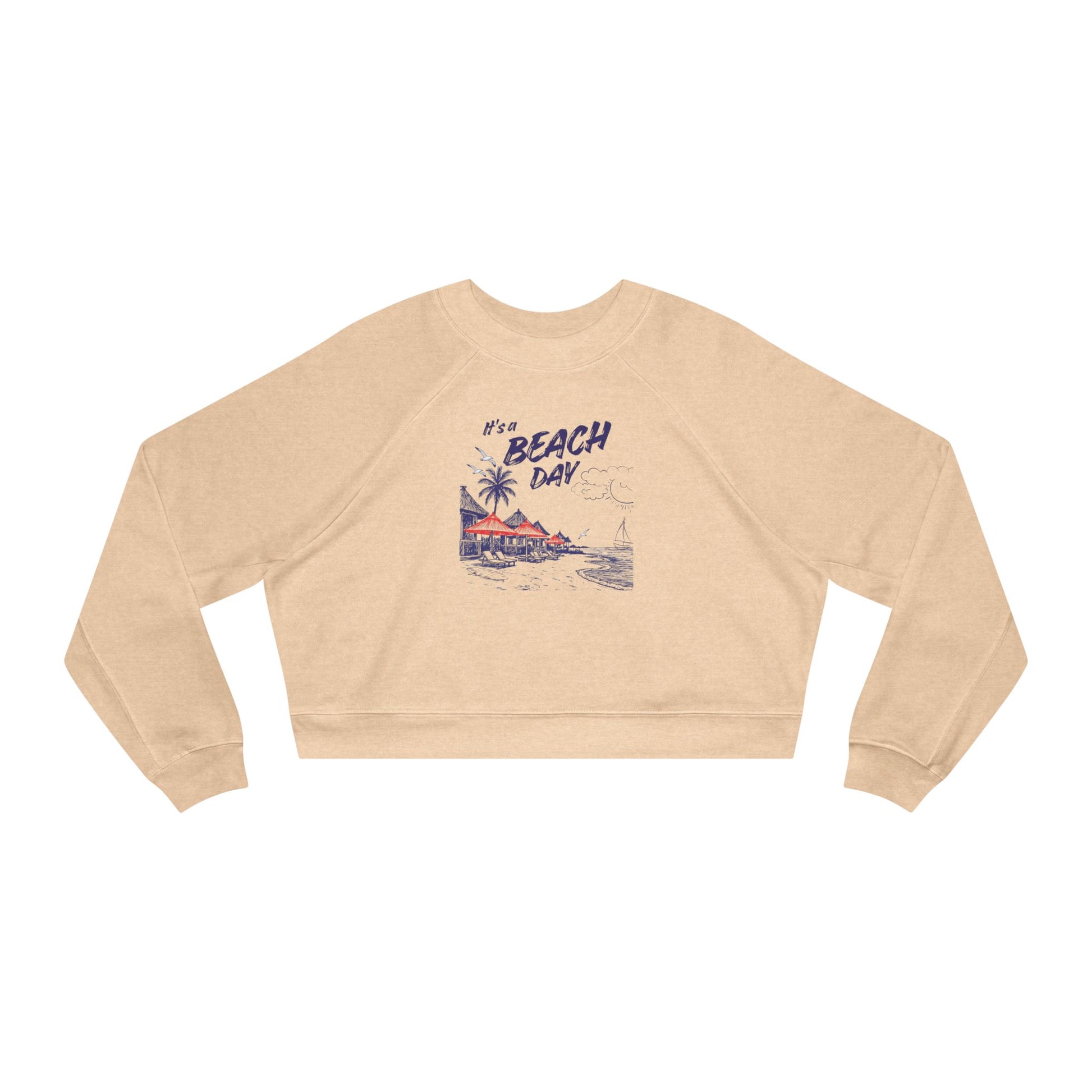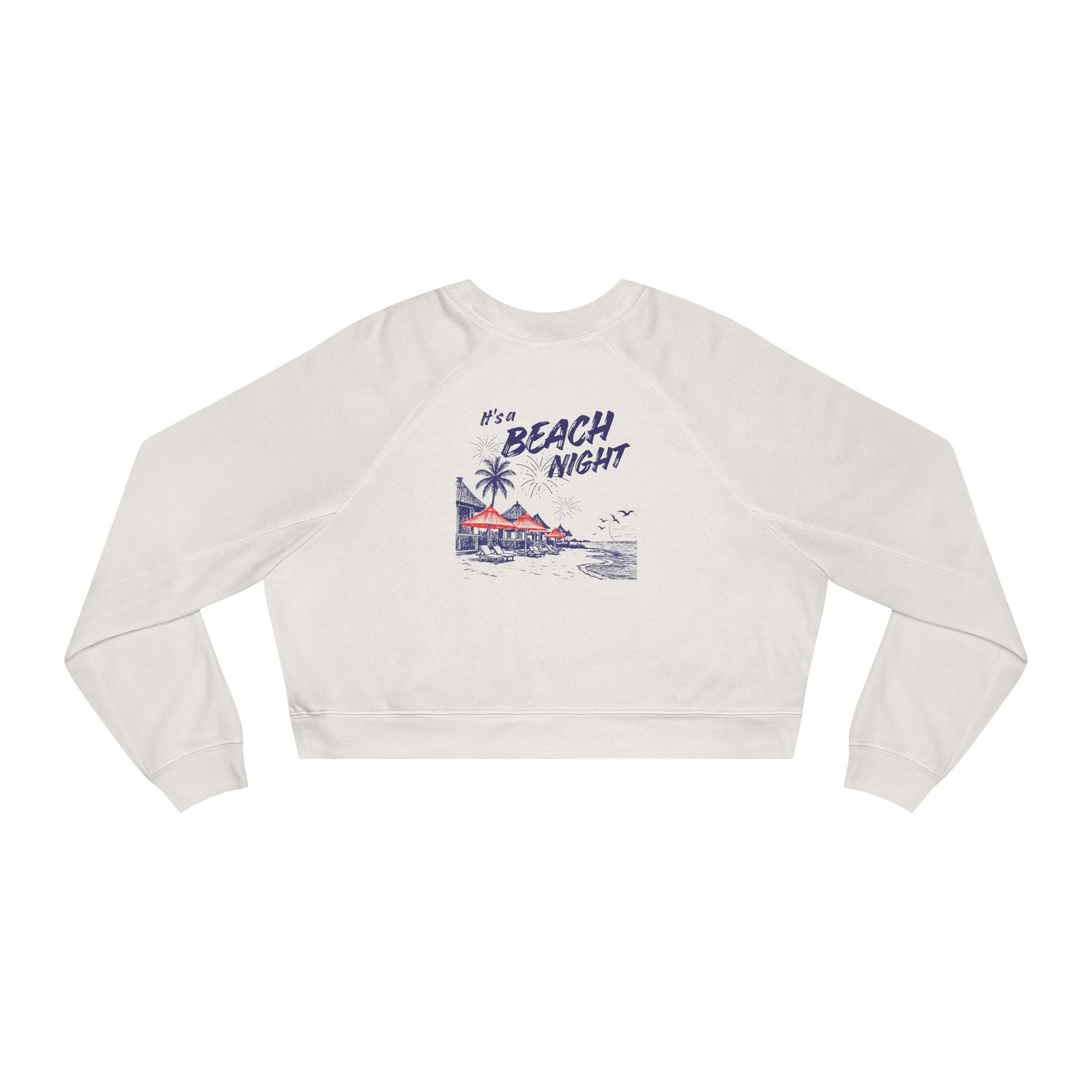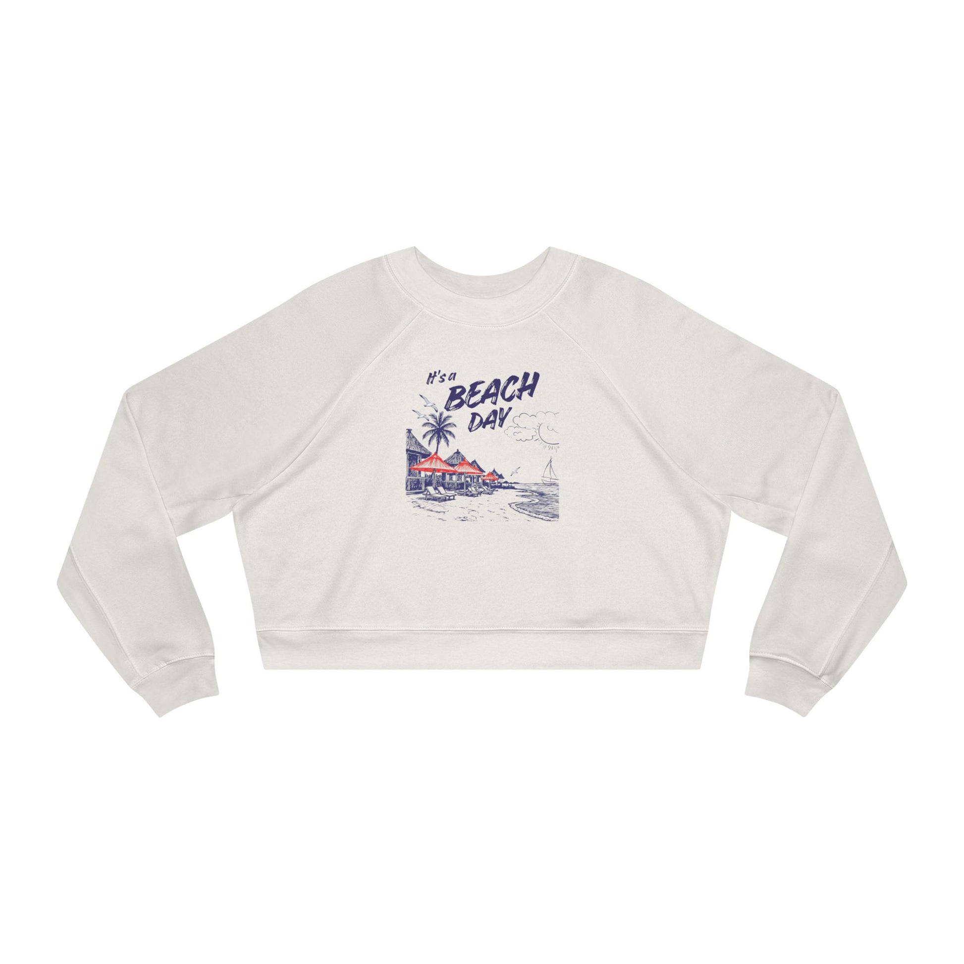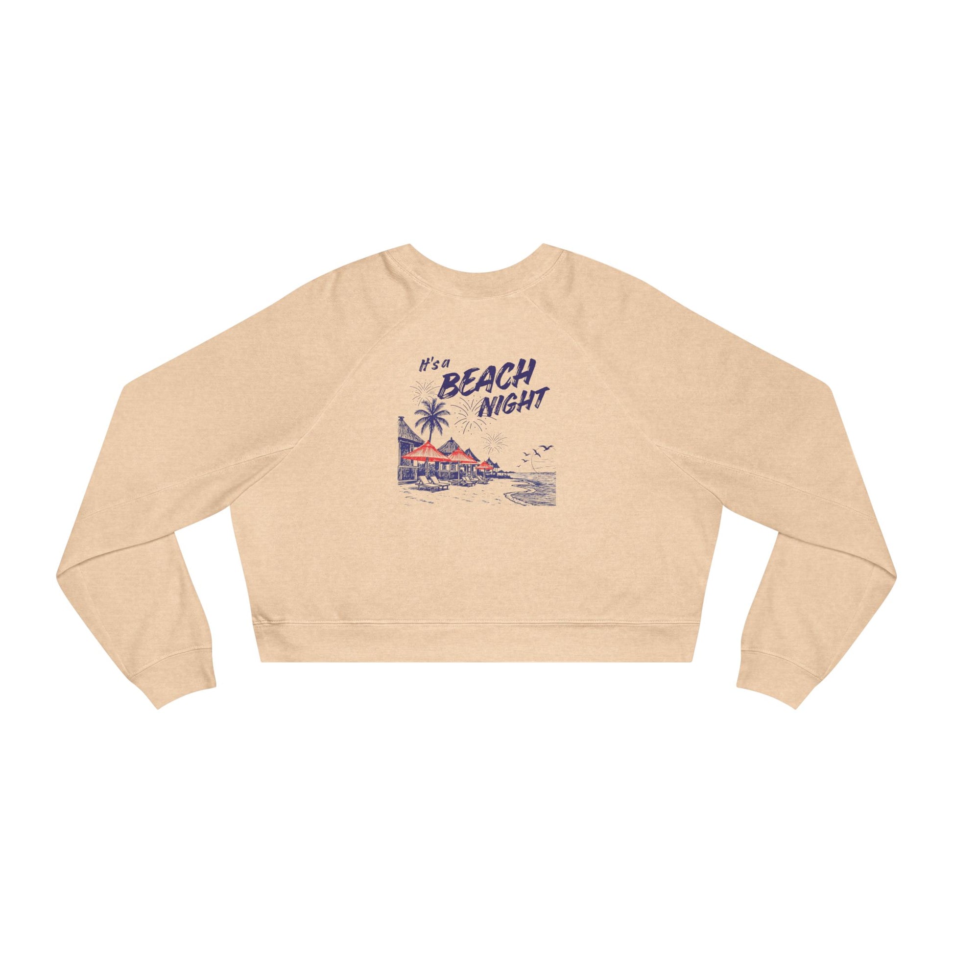 Salt-splashed afternoons folded into a mid-length fleece — this cropped pullover channels lazy beach days and breezy boardwalk walks. The relaxed raglan cut lets you layer a tank or tee underneath without feeling bulky, while the soft combed-ring spun cotton blend keeps the fabric smooth against skin. A muted, weathered 'BEACH' graphic sits centered on the back, evoking sun-bleached signs, palm silhouettes, and the hush of rolling surf. Wear it over high-waist shorts after a sunset dip, on crisp mornings with a coffee in hand, or as the throw-on comfort for a coastal road trip. It’s casual, lived-in, and quietly nostalgic — built to move with you and collect memories, not fuss over them.